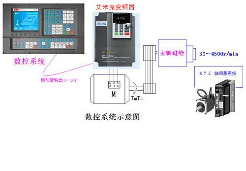 这里我们以5.5kW数控机床来举例说明。电动机额定功率为5.5kW,其额定频率50Hz,其额定电压是380V,其额定电流是13A,额定转速:1400r/min。5.5kw数控机床可以配置艾米克5.5kw变频器,或者配置艾米克7.5kw变频器。