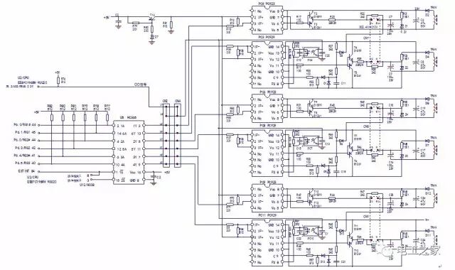 主板MCU输出的6路PWM脉冲信号,往往要经中间一级缓冲/驱动电路,再输入末级驱动电路(有光电隔离作用),若需驱动大功率(一般指100A以上功率模块)模块,驱动IC输出的脉冲信号还要经后级功率放大电路,放大后,再直接驱动IGBT。驱动IC的的输出侧供电,通常采用4路或6路想到隔离的供电电源;而输入侧供电,往往采用+5V或由+5V经稳流电路处理所供给的电源,——驱动IC为光耦合器件,输入、输出侧各有独立的供电电源,和形成独立的供电回路,这是电路原理分析和故障检修中,尤其需要注意的地方。