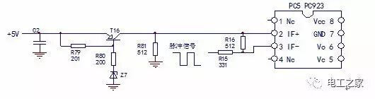 如果用交流电压档,则PC5输入端2、3脚之间的信号,则随启动、停止操作,变化明显,好像脉冲信号已经“正常到来”;换用直流档测量,如果注意一下PC5输入端2、3脚之间的电压极性,故障原因即暴露无遗:T16供电正常时,脉冲信号电压极性为2脚为正,3脚为负。T16供电消失后,测得脉冲电压极性为3脚为正,2脚为负,PC5内部发光二极管处于反向偏置,驱动IC就无法向后级电路传输脉冲信号了。