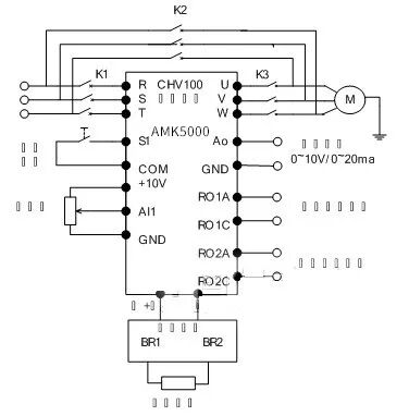 上述电路接线图可实现工变频转换,其中K1与K2互锁。K1与K3导通,变频运行;K2导通工频运行。制动率由制动单元控制板拨码开关确定。